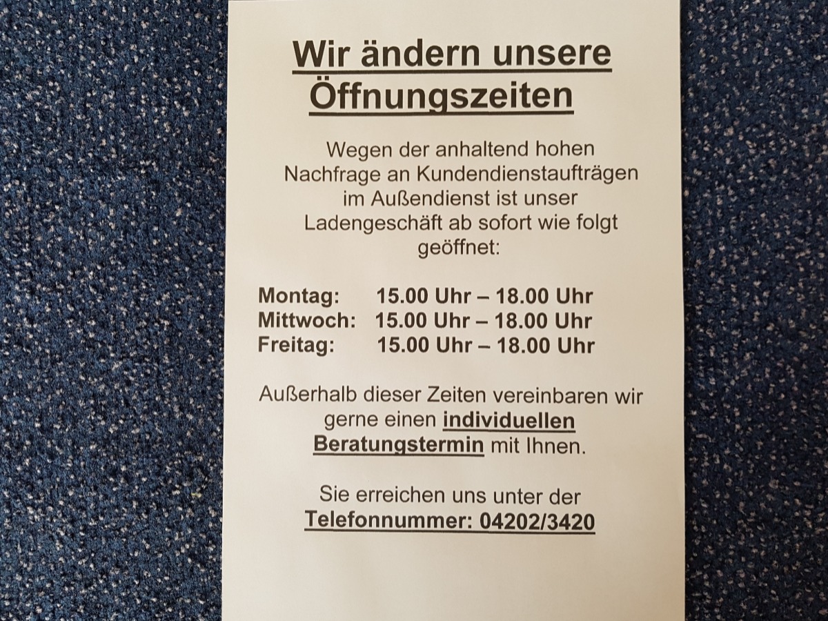 Wegen der anhaltend hohen Nachfrage an Kundendienstaufträgen im Außendienst haben wir unsere Öffnungszeiten geändert.